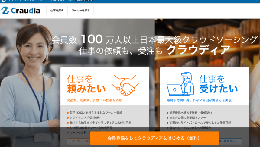 クラウディアは、クラウドソーシングサービスの一つです。クラウドソーシング系のサービスではランサーズやクラウドワークスが老舗で有名です。最近ではクラウドソーシングとは少々違いますがココナラも非常に似た特性を持つサービスです。