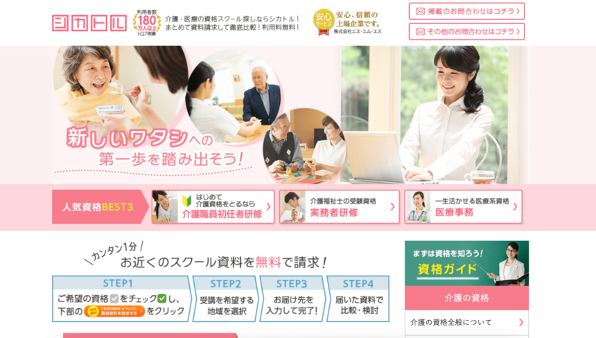 シカトルは医療や介護の資格を取得するためのサービスです。こちらは、SMSという主に介護関係のサービスを行なっている企業が運営してます。そのため、資格取得スクール専業の事業者に比べて色々なメリットがあります。